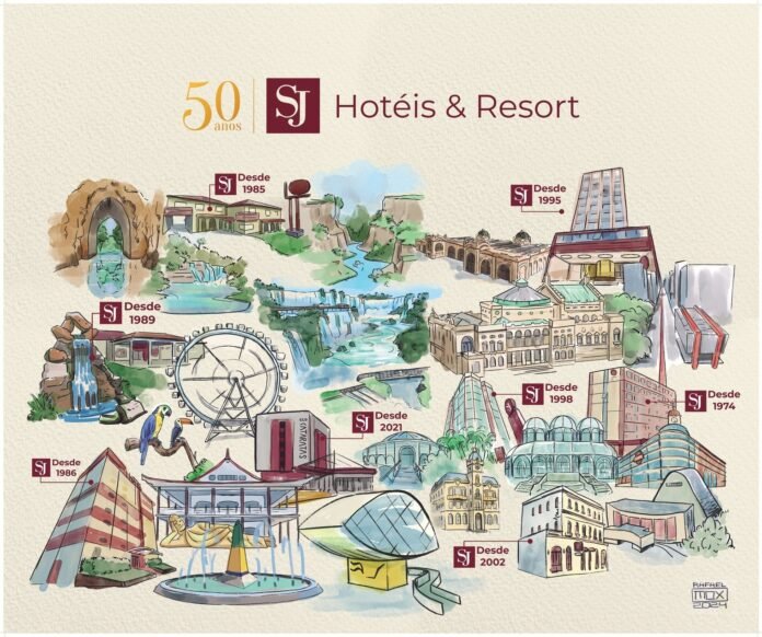 Comemorando 50 anos de história em 2024, a Rede SJ Hotéis & Resort, presente nas cidades de Curitiba, Jaguariaíva, Foz do Iguaçu e São Paulo, celebra o meio século do empreendimento valorizando a arte e os pontos turísticos de cada cidade.
