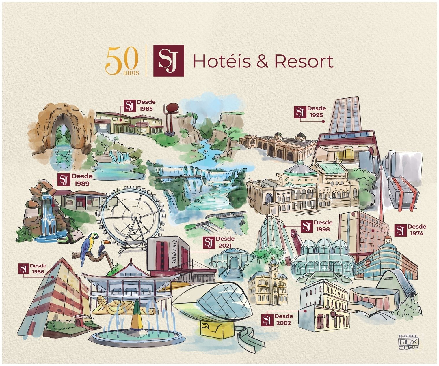 Rafael também pontua como se sente sendo escolhido pela rede para a criação das ilustrações. “É uma honra e um privilégio ter sido escolhido para criar estas ilustrações comemorativas. Como artista, poder contribuir para celebrar os 50 anos da Rede SJ através da minha expressão artística é algo que me traz muita gratidão. A arte tem o poder de contar histórias e conectar pessoas, e espero que as ilustrações que criei não apenas capturem a beleza dos destinos, mas também transmitam a história e o legado da rede de uma maneira visualmente impactante”, finaliza o artista.